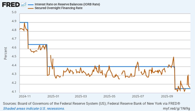Evidence that the warning light is flickering on the repo market is the spread between the Interest On Reserve Balances (IORB) and the Secured Overnight Financing Rate(SOFR).